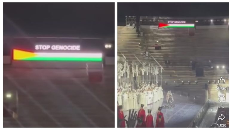 Durante l’Aida all’Arena di Verona, sullo schermo per i sovratitoli è apparsa, per alcuni istanti, la bandiera palestinese accompagnata dalla scritta “Stop Genocide”. Tutto questo nel pieno di una mobilitazione nazionale che, secondo i promotori, aveva “l’obiettivo di rompere il silenzio intorno al dramma che sta colpendo la popolazione palestinese“.