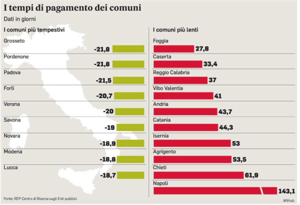 D’altra parte, ci sono comuni che presentano tempi di pagamento significativamente più lenti. Napoli si posiziona all’ultimo posto, con un ritardo medio di ben 143,1 giorni. Altri comuni con ritardi marcati sono Chieti (61,9 giorni), Agrigento (53,5 giorni), Isernia (53 giorni) e Catania (44,3 giorni). Questo evidenzia una notevole differenza nell’efficienza amministrativa tra diverse zone d’Italia, che il Piano Nazionale di Ripresa e Resilienza punta a colmare.