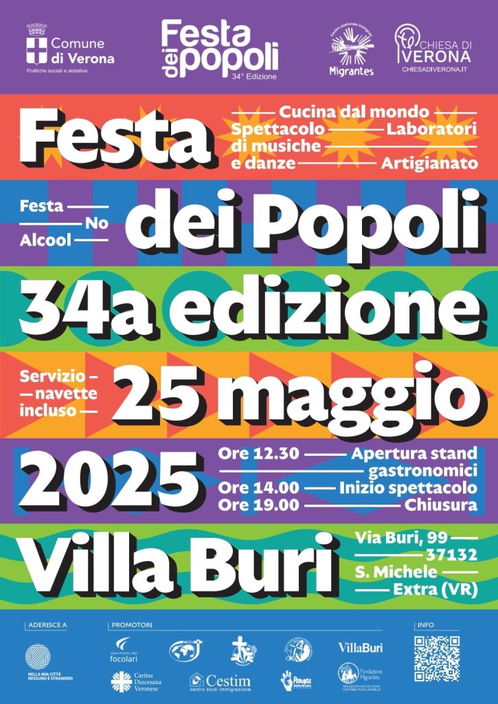 Anche quest’anno Verona celebra il dialogo tra culture con la Festa dei Popoli, appuntamento attesissimo che da 34 anni anima la città con una giornata all’insegna dell’incontro, della festa e della valorizzazione delle diversità. L’edizione 2025 si terrà domenica 25 maggio a Villa Buri, con un ricco programma di eventi, spettacoli e cucina da tutto il mondo.
