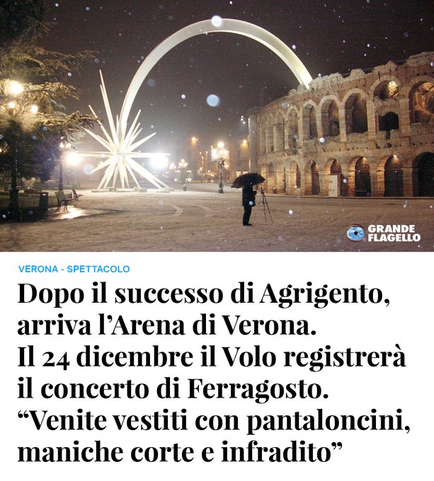 La battuta del profilo satirico Il Grande Flagello: “Il Volo il 24 dicembre all’Arena di Verona per il concerto di Ferragosto”.