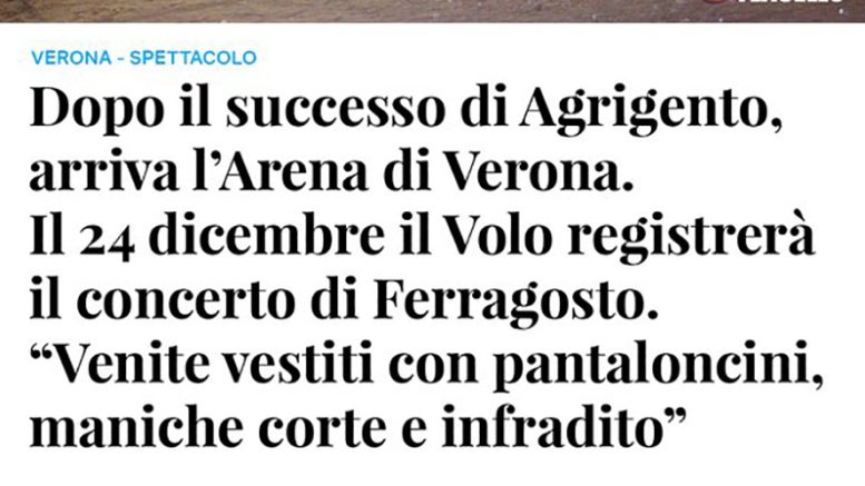 Il Volo in concerto all’Arena di Verona il prossimo 24 dicembre, vigilia di Natale. Per il concerto di Ferragosto. Con il pubblico rigorosamente vestito leggero, maniche corte, infradito e pantaloncini. Che ne pensate?