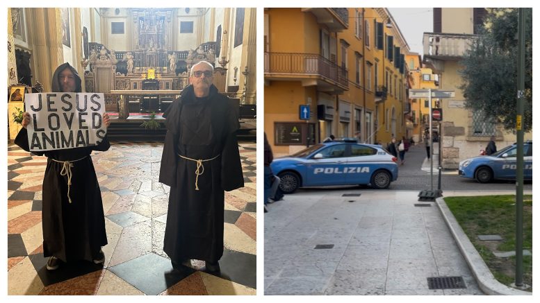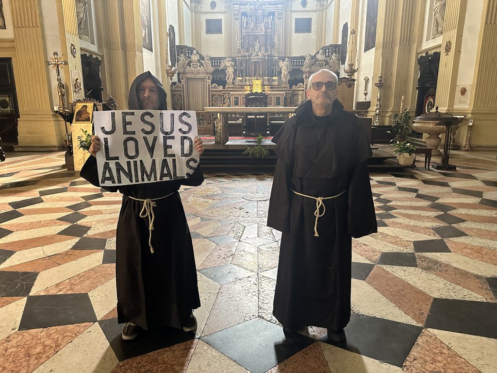 Sollevando, già qualche mese fa, la protesta degli animalisti. Ora, visto che però la protesta non ha sortito alcun effetto, gli stessi animalisti hanno voluto calcare un po’ la mano. E come? Semplice, si sono travestiti da frate e sono entrati. E’ successo nel pomeriggio di venerdì 3 ottobre, quando alcuni militanti di centopercentoanimalisti, travestiti da frati, sono entrati nella chiesa esponendo un cartello in inglese rivolto ai turisti con la scritta: “Jesus loved Animals”.