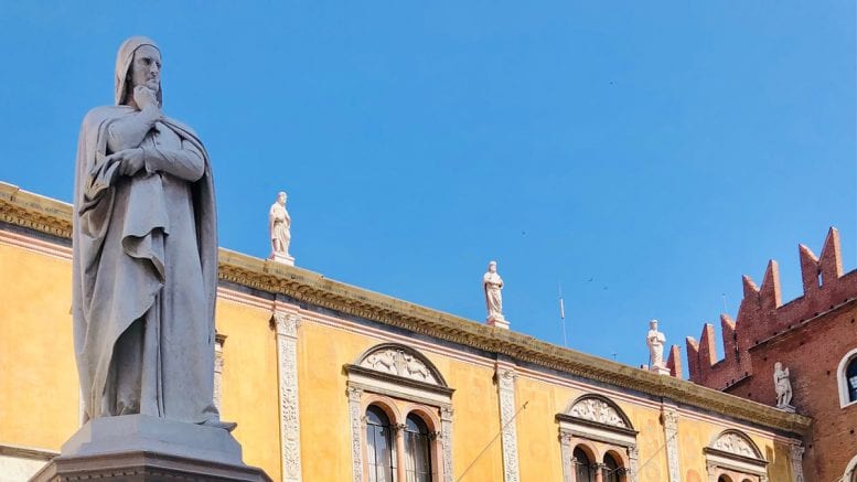 Rimessa a nuovo la statua di Dante, tornata al suo colore bianco tipico del marmo di Carrara. Presente da oltre 150 anni in piazza dei Signori, la monumentale statua di Dante è di nuovo visibile al pubblico al termine di un ampio intervento di restauro conservativo, che ne ha permesso la valorizzazione, in occasione delle celebrazioni per il 700° anniversario della morte del Sommo Poeta.