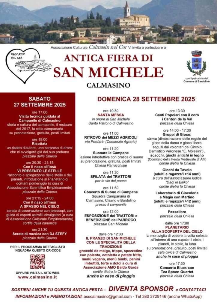 Dal 27 al 28 settembre, Calmasino si anima per l’Antica Fiera di San Michele: ecco il programma di un evento che celebra la storia, la tradizione e il legame con il territorio. La manifestazione, organizzata dall’associazione culturale “Calmasin nel Cor”, offre un ricco programma di iniziative per tutte le età, tra gastronomia, musica, astronomia e attività per le famiglie.