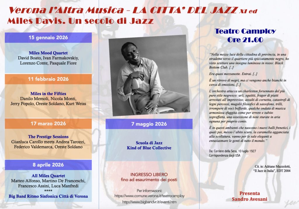 Verona celebra il centenario di Miles Davis: al teatro Camploy torna l’undicesima rassegna “Città del Jazz”. Nel 2026 ricorre infatti l’anniversario della nascita del trombettista di Alton, l’uomo che ha cambiato per sempre i connotati del jazz e della musica popolare del Novecento.