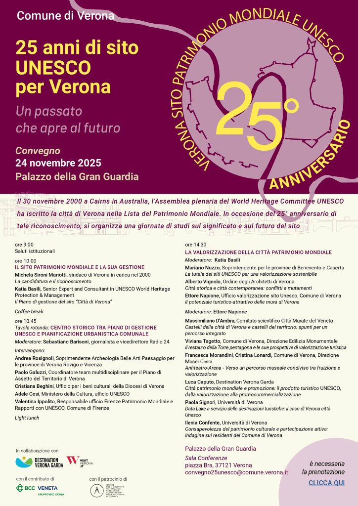 Per onorare questo importante anniversario, è stato organizzato un convegno di studi e approfondimenti. L’evento, intitolato “25 anni di Sito Unesco per Verona – Un passato che apre al futuro”, si terrà il 24 novembre in Gran Guardia dalle ore 9.