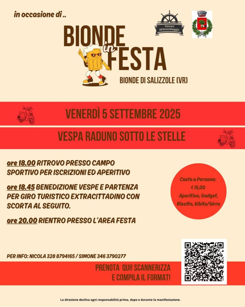 Tutto pronto a Bionde di Salizzole per il quarto Vespa Raduno sotto le stelle, in programma venerdì 5 settembre. L’evento, atteso dagli appassionati della celebre due ruote italiana, propone una serata di motori, amicizia e convivialità all’insegna dello stile unico della Vespa.