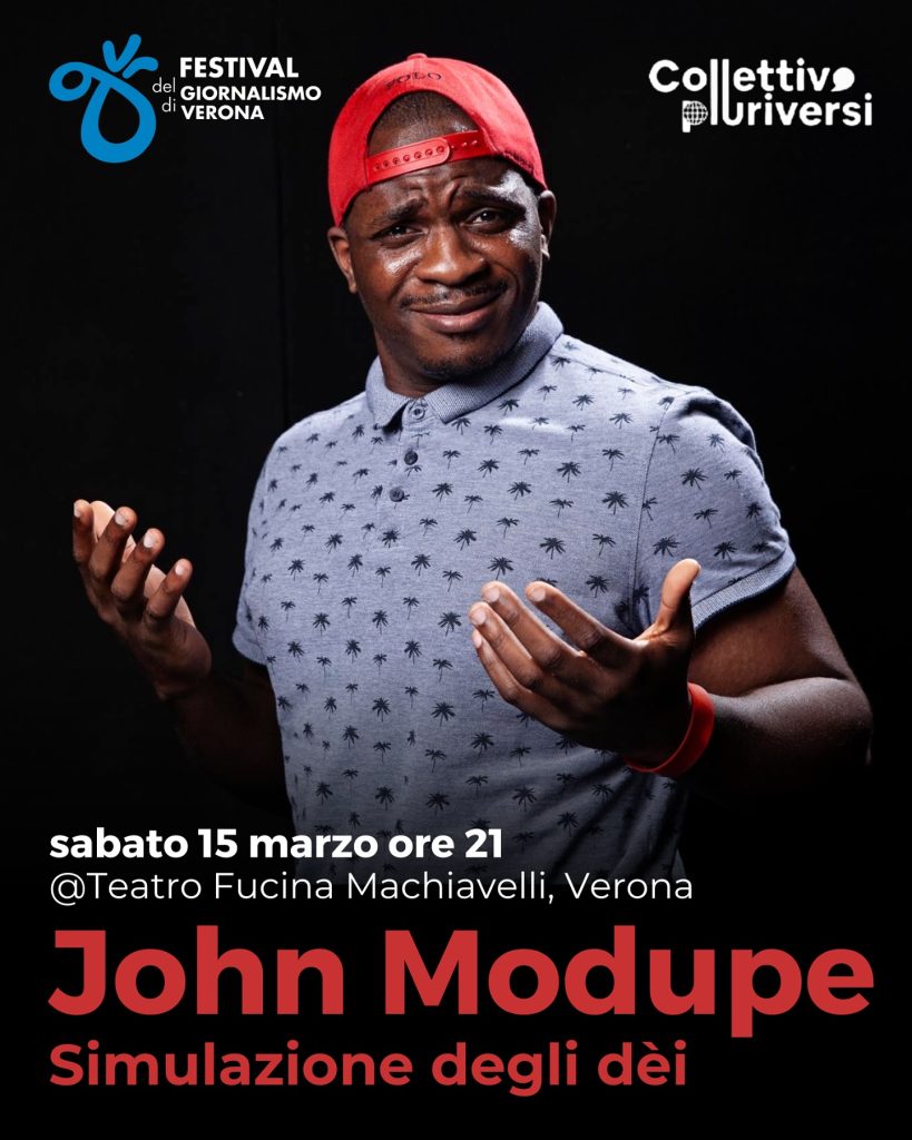 La serata di sabato sarà poi dedicata alla satira con lo spettacolo “Simulazione degli Dei” dello stand up comedian e podcaster italo-nigeriano John Modupe, che alla fine della sua performance sarà intervistato dalla giornalista Tiziana Cavallo.