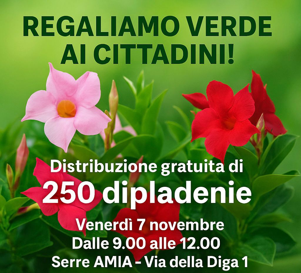 Per evitare sprechi e valorizzare il verde urbano, Amia distribuirà gratuitamente 250 dipladenie ai cittadini. L’iniziativa mira a riutilizzare le piante e a coinvolgere la città nella cura e nel rispetto dell’ambiente.