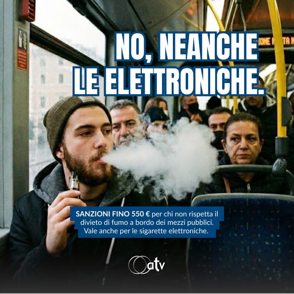 Stop al fumo (anche delle sigarette elettroniche) sugli autobus: Atv Verona annuncia tolleranza zero e multe fino a 550 euro. Atv Verona ha lanciato una nuova campagna di sensibilizzazione per ricordare a tutti i passeggeri che il divieto di fumo a bordo dei mezzi pubblici è assoluto e non ammette deroghe.