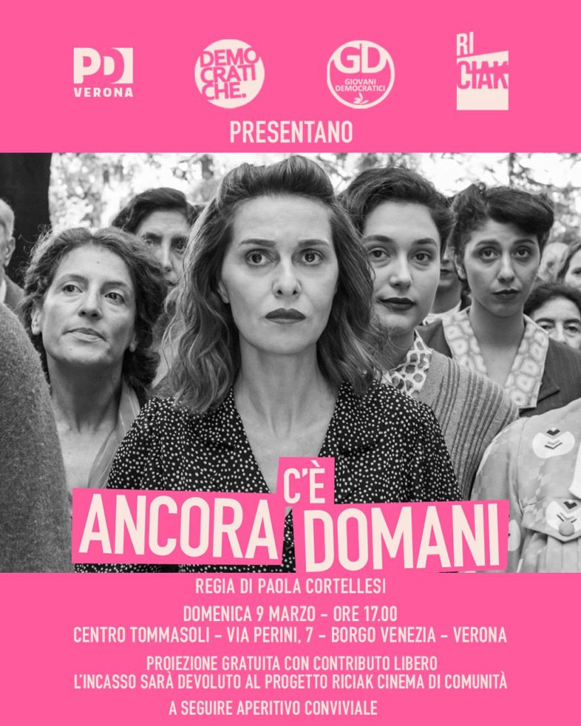 Per la Giornata della donna proiezione del film “C’è ancora domani” di Paola Cortellesi al centro Tommasoli di Verona.