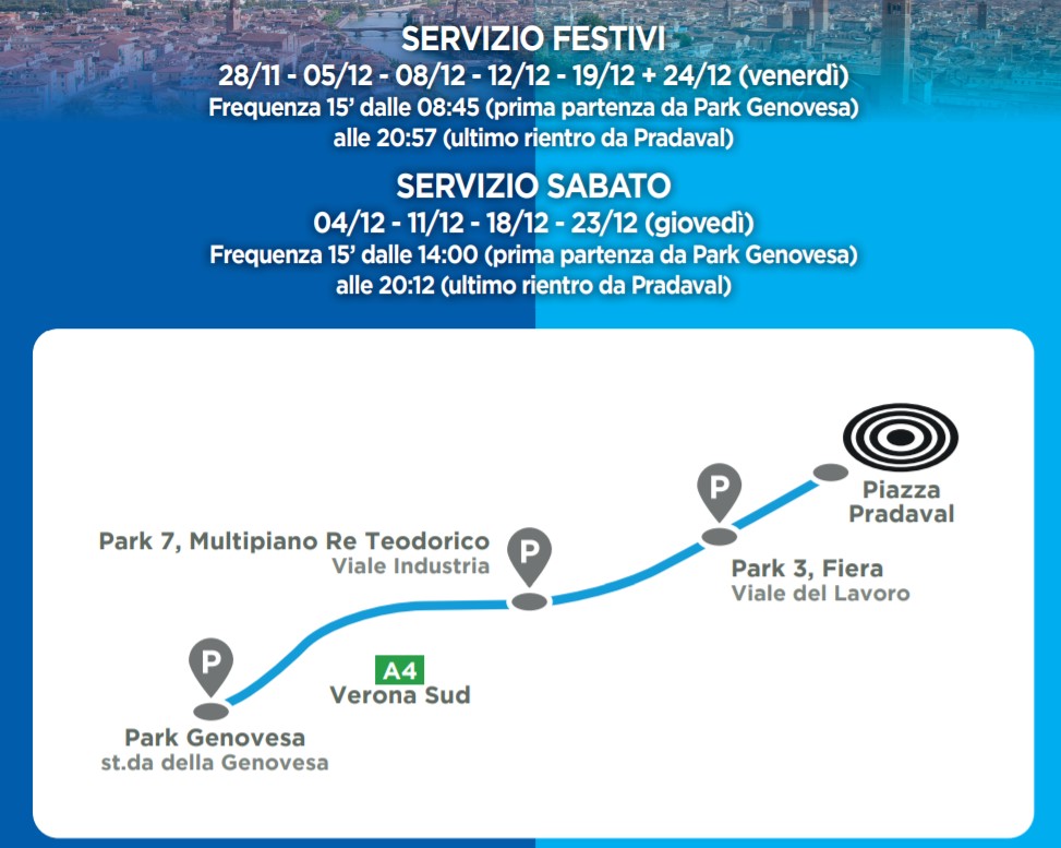 In caso di necessità Veronafiere aprirà anche il Multipiano con 1.700 posti auto e il Re Teodorico con altri 1.000, per un totale di 4.700 stalli pronti ad accogliere i flussi di traffico delle feste. Un sistema rapido ed efficiente, grazie anche ai collegamenti bus pianificati da Atv in modo da evitare il congestionamento delle vie e dei parcheggi attigui al centro storico. Un modo per evitare di perdere tempo in coda alla ricerca di uno stallo libero.