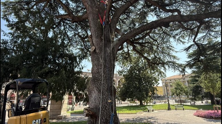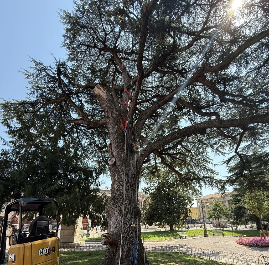 Il cedro di piazza Bra è salvo: si è concluso alla vigilia di Ferragosto il delicato intervento di messa in sicurezza definitiva del maestoso Cedrus libani, alto quasi 20 metri, dal peso di 16 tonnellate e con oltre 150 anni di storia.