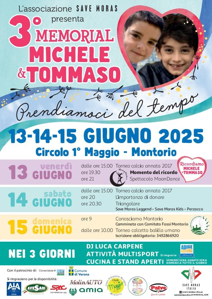 Dal 13 al 15 giugno, Montorio si trasformerà in un grande abbraccio collettivo per ricordare i piccoli Michele e Tommaso, tragicamente scomparsi quasi quattro anni fa nella ghiacciaia della Lessinia. Torna infatti, per la sua terza edizione, il Memorial Michele & Tommaso, una tre giorni di eventi promossa dall’associazione Save Moras Italia, con il patrocinio dell’8a Circoscrizione.