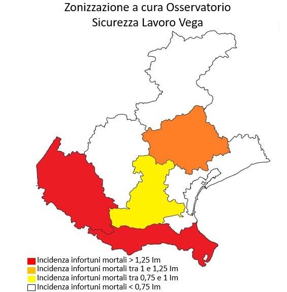 Secondo la mappatura del rischio rispetto all’incidenza della mortalità, la zona gialla, quella in cui è entrato il Veneto a fine maggio 2023, è la zona che, subito dopo la bianca, raggruppa le regioni con l’incidenza di mortalità sul lavoro tra le meno elevate a livello nazionale. In sostanza, a fine maggio 2023 il rischio di infortunio mortale in Veneto (11,7 morti per milione di occupati) risulta identico alla media nazionale.