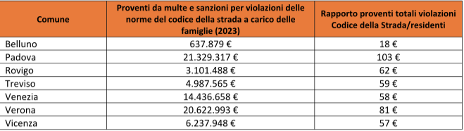 Analizzando gli importi pro capite, emerge che Padova si posiziona al primo posto con una sanzione pro capite pari a 103 euro, seguita da Verona con 81 euro. Rovigo completa il podio pro capite con 62 euro a testa.