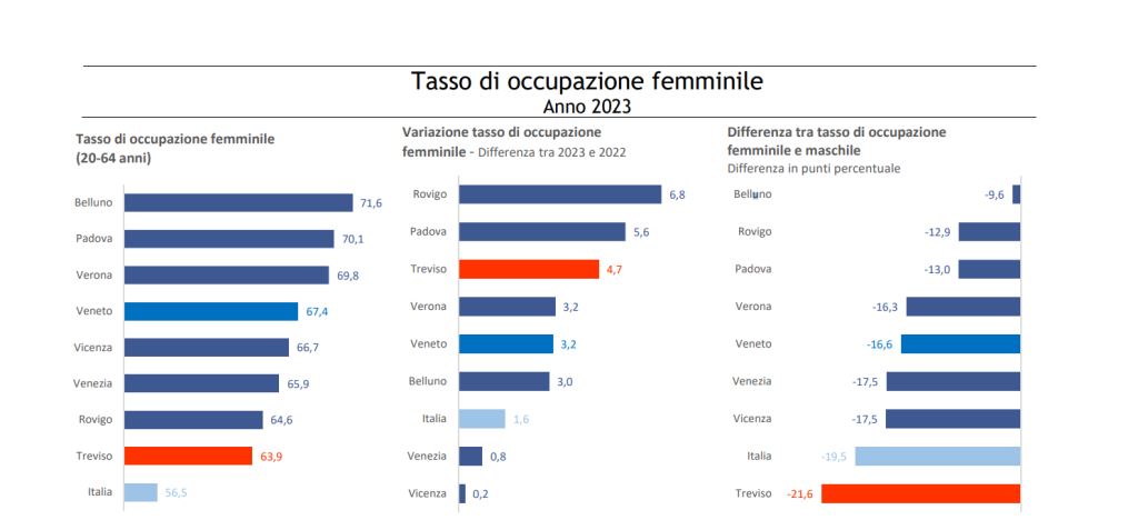 Nel grafico sottostante è mostrato il tasso di occupazione femminile, con riferimento all’anno 2023, nei vari comuni veneti. Verona mostra un dato più alto rispetto alla media nazionale (69,8%) con una differenza del tasso di occupazione femminile e maschile del 16,6%. I dati fanno riferimento al report “Mercato del lavoro: confronto tra province venete” promosso dalla Provincia di Treviso.