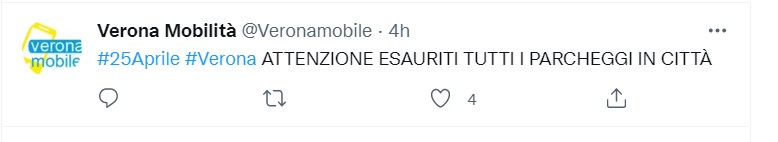 Verona presa d’assalto per il ponte del 25 aprile e per il primo dei 14 concerti di Zucchero in Arena: fin dal primo pomeriggio i posti auto hanno cominciato a scarseggiare, tanto che la stessa polizia locale di Verona ha comunicato che i parcheggi erano esauriti: Arena, Cittadella, piazza Isolo, Arsenale e Tribunale tutti pieni.