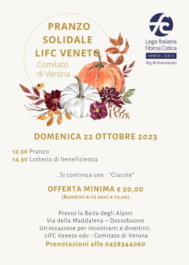 Un pranzo solidale per la ricerca sulla fibrosi cistica: è quello che andrà in scena domenica 22 ottobre presso la baita degli alpini di via delle Maddalene a Dossobuono, frazione di Villafranca. L’iniziativa è organizzata dalla Lega italiana fibrosi cistica del Veneto, comitato di Verona. Al termine del pranzo è prevista una lotteria di beneficenza.