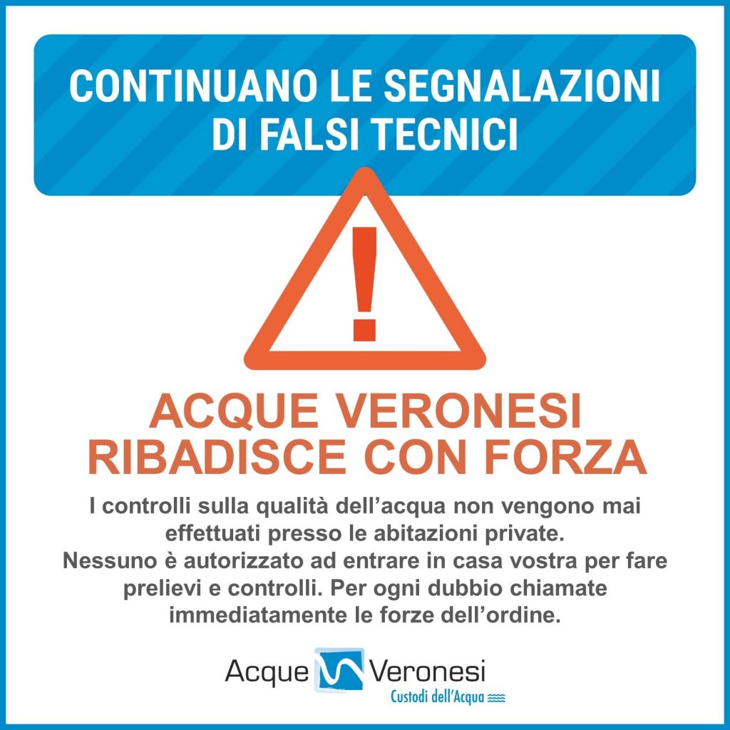 “Ci hanno segnalato – scrive in una note l’azienda – che un presunto tecnico di Acque Veronesi si presenta nelle abitazioni con la scusa di verifiche sulla qualità dell’acqua o per proporre la vendita di purificatori o filtri per i rubinetti. La persona è stata descritta di giovane età, capelli scuri e un tesserino naturalmente falso. Si raccomanda di avvisare i familiari soprattutto anziani, a non accettare mai qualsiasi richiesta simile e si raccomanda di avvisare le forze dell’ordine”.