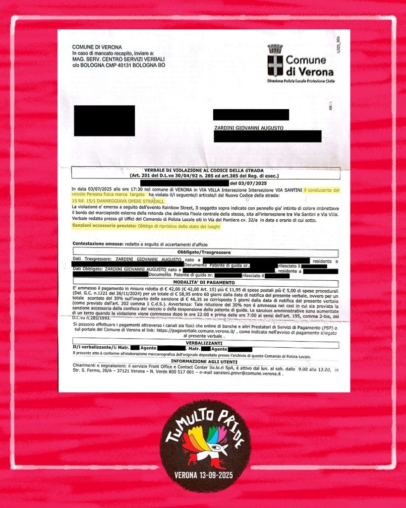 Il verbale, emesso dalla Direzione Polizia Locale e Protezione Civile del Comune di Verona e ritirato da Zardini il 22 agosto, qualifica l’intervento come “danneggiamento opere stradali”. La decisione, però, non è stata accolta in modo unanime. All’interno della Rete Verona Rainbow prevale lo stupore per il fatto che la sanzione sia stata indirizzata a un singolo attivista, nonostante l’iniziativa fosse collettiva.