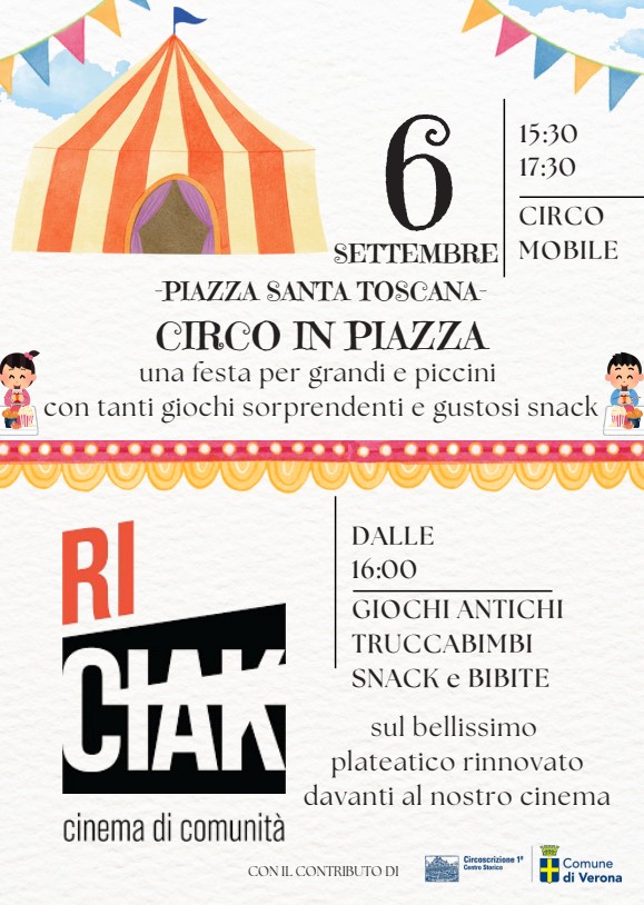 Sarà una giornata di festa quella in programma sabato 6 settembre a Veronetta, dove dalle 15.30 prenderà vita l’evento “Circo in Piazza”. È organizzato dall’impresa sociale Vive Visioni – progetto Ri-Ciak Cinema di comunità con il sostegno della Circoscrizione 1a.