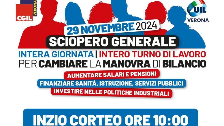 Venerdì 29 novembre è previsto uno sciopero generale proclamato da Cgil e Uil contro la manovra di bilancio del governo. La protesta, ridotta a 4 ore per il settore dei trasporti pubblici a seguito di un’ordinanza del Ministero delle Infrastrutture, interesserà anche la città di Verona, dove potrebbero verificarsi disagi per gli utenti dei mezzi pubblici e non solo.