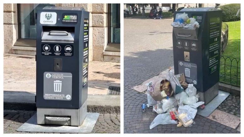 Verona, i tre nuovi bidoni autocompattanti installati in piazza Bra al posto dei 53 tradizionali non sembrano sufficienti.