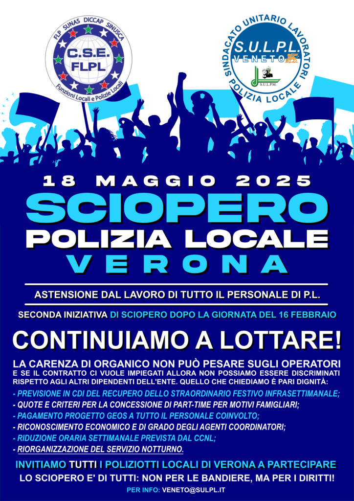 Secondo la sigla sindacale, la scelta del 18 maggio non è casuale: “La polizia locale sarà chiamata, come ogni anno, a uno sforzo straordinario in occasione della Straverona. È una scelta necessaria per farci ascoltare”.