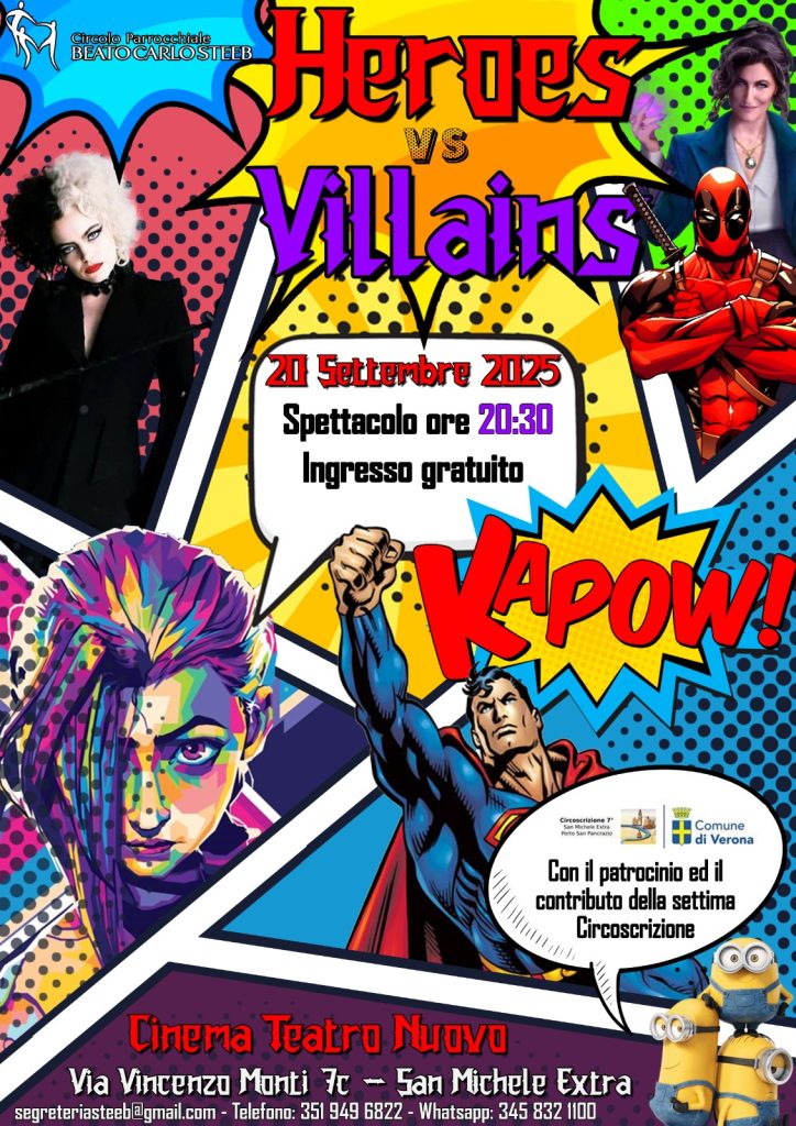 Sabato 20 settembre, alle 20.30, il Cinema Teatro Nuovo di San Michele Extra ospiterà lo spettacolo di danza “Heroes vs Villains”. È il saggio di fine anno organizzato dal Circolo Parrocchiale Beato Carlo Steeb, con il patrocinio della Circoscrizione 7.