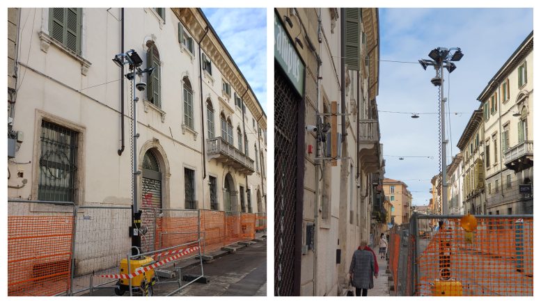 Maxi cantiere di via XX Settembre a Veronetta, installati oggi i sistemi di sicurezza. Sono state posizionate due torri da quattro telecamere ciascuna, controllate da remoto dalla Centrale della polizia locale, che garantiscono la videosorveglianza lungo entrambi i marciapiedi a fianco delle recinzioni e nell’area del cantiere dall’incrocio con via San Paolo a via XX Settembre, all’altezza dell’incrocio con vicolo Vetri (civici 17 e 18).