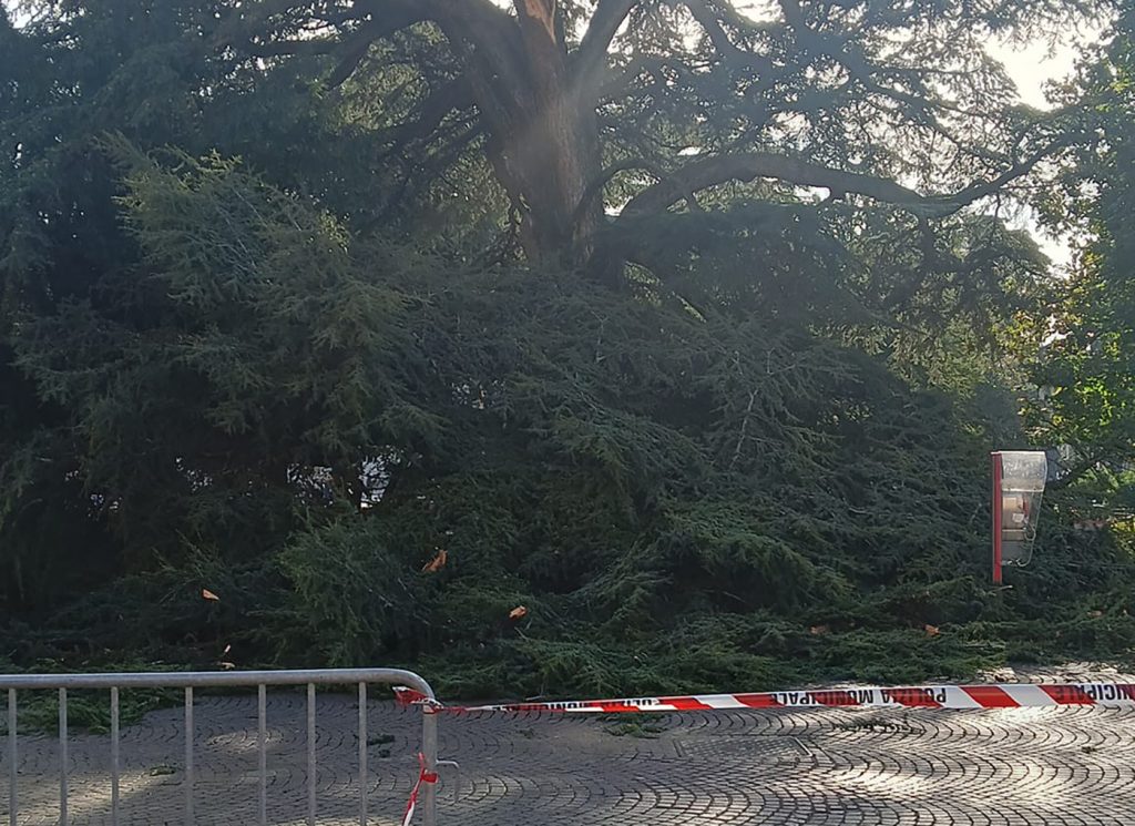 Danneggiati anche un lampione dell’illuminazione pubblica e la cabina telefonica dei giardini. Sul posto sono accorsi i vigili del fuoco, con due mezzi, tra cui un autoscala, e 7 operatori, oltre a soccorritori, polizia e tecnici Amia, per mettere in sicurezza l’area e transennare la zona a rischio. Presente anche il sindaco Damiano Tommasi e agenti della polizia locale di Verona, già in piazza Bra per la cerimonia di commemorazione dei caduti di Nassirya, che hanno provveduto a dichiarare interdetta al pubblico l’intera area fino a ulteriori verifiche da parte di tecnici del comune.