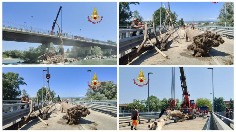 L’operazione, durata l’intera giornata, ha richiesto la chiusura al traffico veicolare del ponte. Due squadre specializzate sono intervenute utilizzando tecniche SAF (Speleo Alpino Fluviale) per raggiungere in sicurezza il greto del fiume. Una volta individuati e ancorati i tronchi agli appositi sistemi di sollevamento, i detriti sono stati issati sull’impalcata del ponte con l’ausilio di un’autogru.
