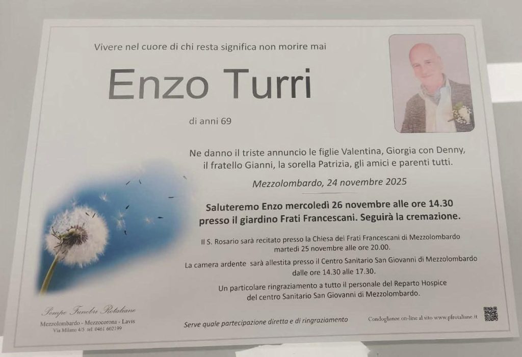 L’ultimo saluto a Enzino Turri, scomparso all’età di 69 anni, inizierà con il Rosario che sarà recitato stasera, martedì 25 novembre, alle ore 20 nella chiesa dei Frati Francescani di Mezzolombardo.