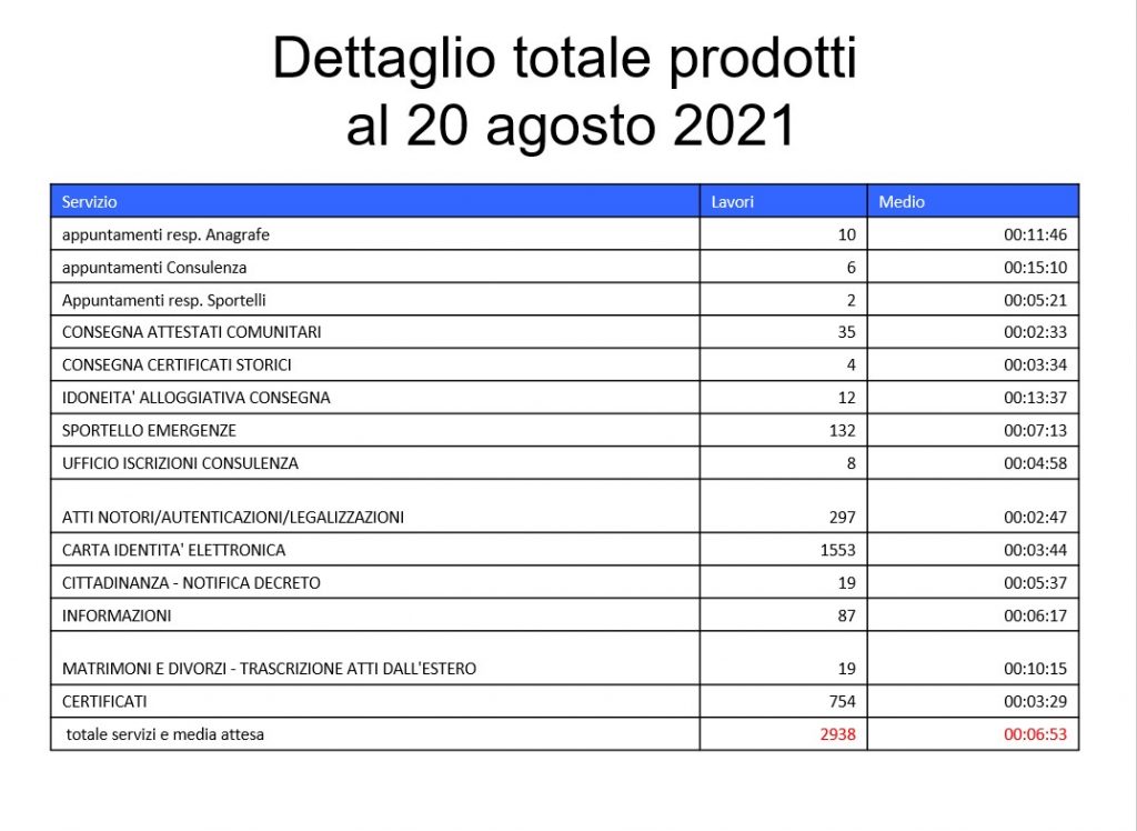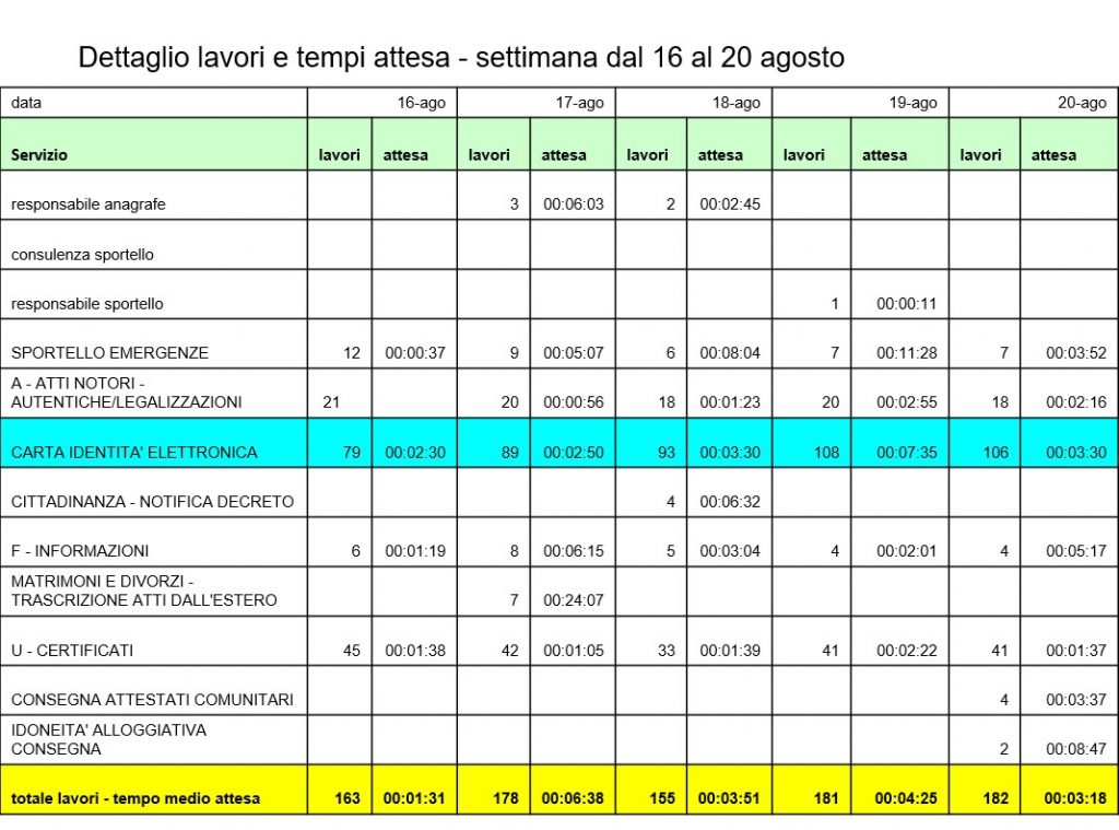 Ed ecco i dati snocciolati dal Comune. In agosto sono stati 2.938 gli accessi agli uffici di via Adigetto. E l’attesa media per essere chiamati è stata di 6 minuti e 53 secondi. A far avanzare il cronometro gli appuntamenti per le consulenze, che a volte sono durate più del previsto se l’utente aveva richieste aggiuntive. Altrimenti per la consegna di carte d’identità elettroniche, attestati comunitari, atti notori l’attesa si è attestata sui 2-3 minuti. Nello specifico, dal 16 al 20 agosto sono stati registrati 859 accessi. Le persone hanno dovuto aspettare in media 4 minuti e 54 secondi. Tra i servizi più richiesti il rilascio di carta d’identità digitale, 469 accessi per un’attesa di 2 minuti e 48 secondi, e la consegna di 202 certificati, per i quali gli utenti hanno aspettato in media 1 minuto e 40 secondi. Nessuna coda quindi fuori dagli sportelli, se non di chi è arrivato molto prima rispetto all’orario di prenotazione.