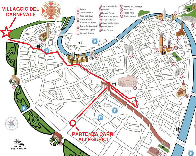 - dalle 11, per il tempo necessario al transito del corteo e del successivo passaggio dei mezzi AMIA interessati alle operazioni di pulizia delle strade, divieto di transito dei veicoli ad eccezione dei carri allegorici partecipanti alla sfilata, dei mezzi di pronto intervento e di soccorso, in Corso Porta Nuova, carreggiata con direzione da Porta Nuova a piazza Bra, piazza Bra, via degli Alpini, piazzetta Municipio, via Leoncino, Piazza Bra, via Roma, corso Castelvecchio, largo Don Bosco, Regaste San Zeno, piazzetta Portichetti, via San Giuseppe, piazza Corrubbio, nel tratto compreso tra via San Giuseppe e via Barbarani, piazza Pozza, piazza San Zeno, via Porta San Zeno, fino all’incrocio semaforico, via Vittime Civili di Guerra, circonvallazione Maroncelli, dove i carri verranno smontati, novità richiesta dagli organizzatori;