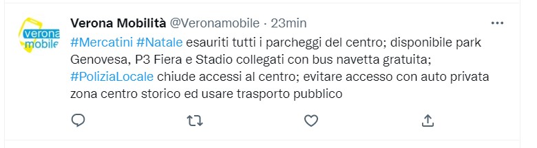 Mercatini di Natale a Verona, tutto esaurito in centro e parcheggi pieni.