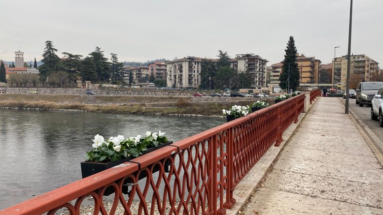Posate 250 viole bianche su ponte Catena, l’idea del Comune di Verona è di metterle anche su ponte Garibaldi per l’inverno.