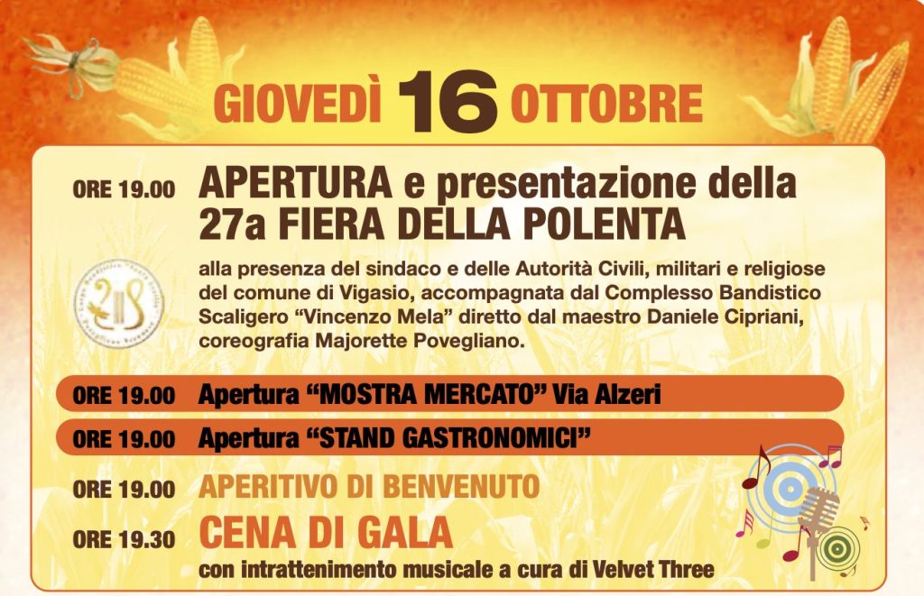 Ore 19.00 apertura e presentazione della 27a Fiera della Polenta alla presenza del sindaco e delle Autorità Civili, militari e religiose del comune di Vigasio, accompagnata dal Complesso Bandistico Scaligero “Vincenzo Mela” diretto dal maestro Daniele Cipriani, coreografia Majorette Povegliano.