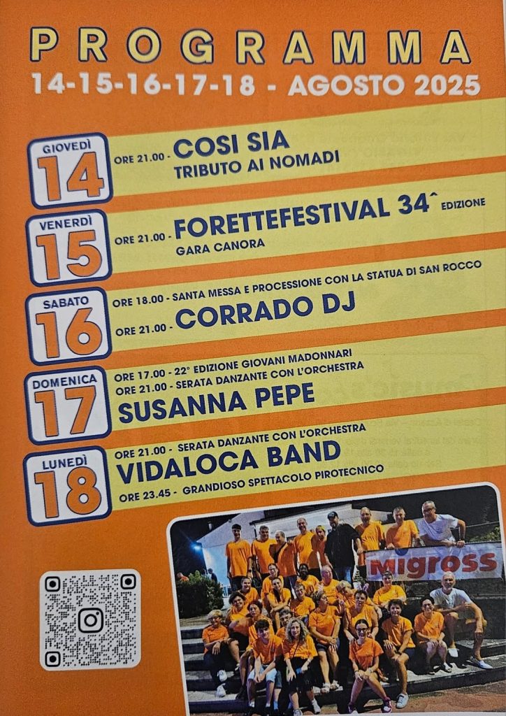Forette si prepara a vivere cinque giorni di festa e divertimento con la Sagra di San Rocco: il programma è ricco di musica, tradizione religiosa e spettacoli per tutte le età. Dal 14 al 18 agosto, la comunità accoglierà residenti e visitatori con una serie di appuntamenti serali pensati per animare l’estate.