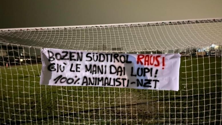 Blitz animalista a Villafranca contro la mattanza dei lupi in Sud Tirolo. Nella serata del 20 dicembre, approfittando della partita di serie D giocata dal Villafranca contro la Virtus Bolzano, militanti di Centopercentoanimalisti sono entrati all’interno dello stadio comunale e hanno appeso sulla rete di porta uno striscione contro quello che definiscono “lo sterminio dei lupi che si sta pianificando nella provincia italiana tra le più insensibili nei confronti degli animali”.